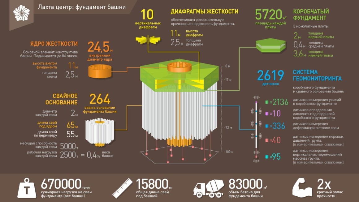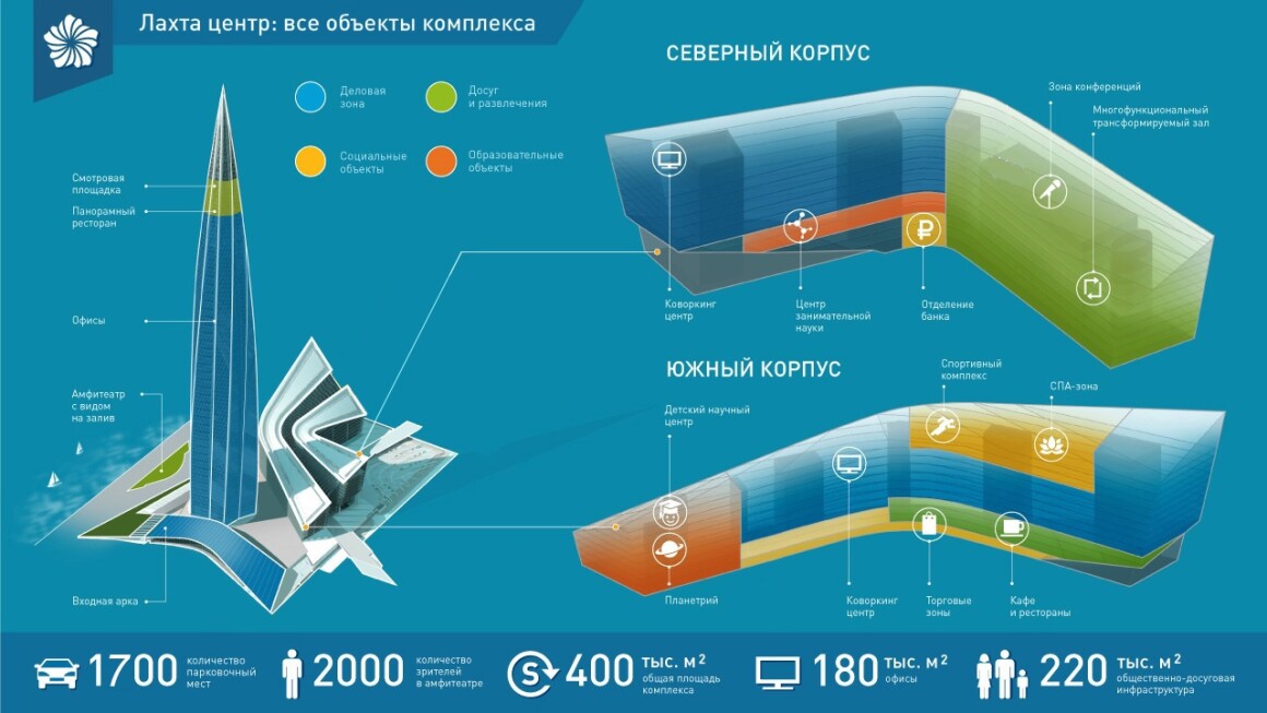 Самый северный небоскрёб, самое высокое здание Европы, новый центр Петербурга, штаб-квартира группы компаний Газпром.